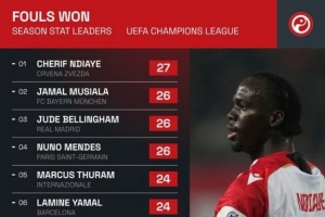 體育資訊5月9日訊 Squawka統(tǒng)計了本賽季歐冠球員被侵犯的次數(shù),并列出榜單,穆西亞拉、貝林厄姆、努諾-門德斯26次被侵犯并列第二多。