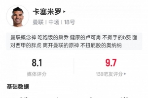 體育資訊5月9日訊 歐聯(lián)杯半決賽次回合,曼聯(lián)4-1畢爾巴鄂競技。卡塞米羅首發(fā)出戰(zhàn),貢獻1粒進球,送出7次搶斷,還有3次解圍,評分8.1。