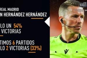 皇馬TV視頻中寫道,皇馬在埃爾南德斯執(zhí)法比賽時勝率很低只有54%,過去6場只有2場贏球。