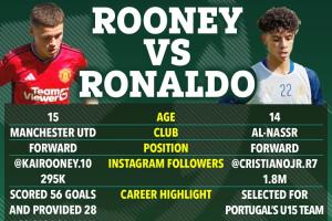 本周葡萄牙足協公布了新一期U15國家隊的名單,C羅的兒子,效力于利雅得勝利青年隊的克里斯蒂亞諾-多斯-桑托斯(迷你羅)入選。而C羅老隊友魯尼的兒子同樣天賦異稟,《太陽報》將兩人放在一起對比。
