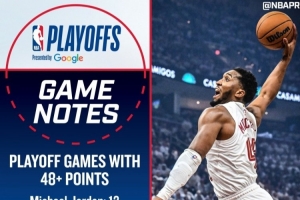 據(jù)統(tǒng)計,這是米切爾生涯第4次在季后賽單場砍下至少48分,與詹姆斯、艾弗森、杰力-韋斯特、張伯倫并列歷史第二,僅次于喬丹(12次)。