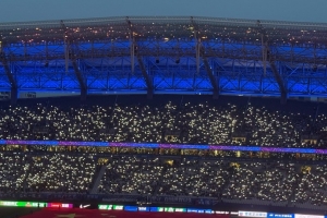 中超第12輪,結束三連客的申花回到上海體育場迎戰(zhàn)青島西海岸。比賽開始之前,申花現(xiàn)場球迷打開手機閃光燈,營造出星空的氛圍。