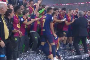 賽后巴薩主席拉波爾塔蹦蹦跳跳慶祝,準(zhǔn)備舉杯時(shí)雙膝跪地,隨后開心舉起了獎(jiǎng)杯。
