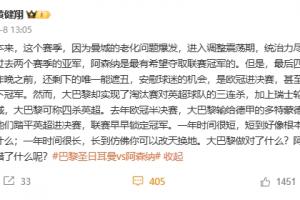 黃健翔:“本來,這個(gè)賽季,因?yàn)槁堑睦匣瘑栴}爆發(fā),進(jìn)入調(diào)整震蕩期,統(tǒng)治力盡失,作為過去兩個(gè)賽季的亞軍,阿森納是最有希望奪取聯(lián)賽冠軍的。但是,最后四大皆空。昨晚之前,還剩下的唯一能遮丑,安慰球迷的機(jī)會,是歐冠進(jìn)決賽,甚至,憧憬一下冠軍。然而,大巴黎卻實(shí)現(xiàn)了淘汰賽對英超球隊(duì)的三連殺,加上瑞士輪4:2曼城,大巴黎可稱四殺英超。去年歐冠半決賽,大巴黎輸給德甲的多特蒙德,今年,他們踏平英超進(jìn)決賽,聯(lián)賽早早鎖定冠軍。一年時(shí)間很短,短到好像根本來不及做什么;一年時(shí)間很長,長到仿佛你可以改天換地。大巴黎做對了什么?阿森納又做錯(cuò)了什么呢?”