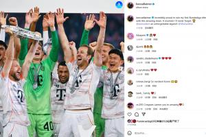 體育資訊5月11日訊 本輪德甲,拜仁以2-0擊敗門興,并在賽后迎來(lái)了德甲冠軍頒獎(jiǎng)典禮,拜仁球員萊默爾在賽后更新了社交媒體。