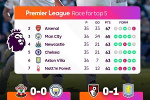 體育資訊05月11日訊 英超第36輪曼城0-0戰(zhàn)平南安普頓,維拉1-0擊敗伯恩茅斯,英超爭(zhēng)五的形勢(shì)更加復(fù)雜。