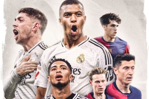 姆巴佩、貝林厄姆和巴爾韋德出鏡,巴薩球員中,也有萊萬、德容等人。海報上方為對陣雙方以及比賽性質等信息,右下角為比賽體育場。