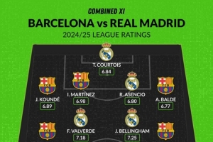 WhoScored根據球員本賽季西甲的場均評分列出國家德比陣容,萊萬、姆巴佩、亞馬爾、貝林厄姆在列。