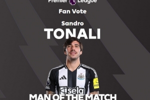 本場(chǎng)比賽托納利在開場(chǎng)2分鐘為球隊(duì)先拔頭籌,賽后他也當(dāng)選英超官方球迷票選全場(chǎng)最佳球員。
