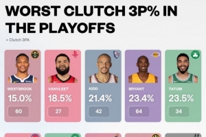 上榜條件:至少25次季后賽關(guān)鍵三分出手