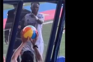 一名巴薩球迷手舉著一個沙灘球,而維尼修斯憤怒的用手指著這名球迷。