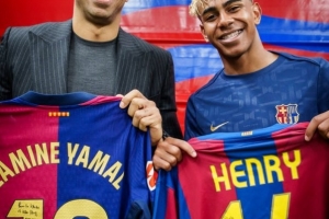 本場(chǎng)比賽亞馬爾再度破門,賽后巴薩官推也曬出一張亞馬爾與亨利的合影,雙方交換了簽名球衣。