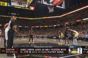 米切爾罰球,現(xiàn)場給出字幕:連續(xù)季后賽兩場都砍下40+,隊史僅有他和詹姆斯做到