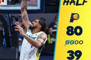體育資訊5月12日訊 系列賽G4上半場,步行者主場80-39領(lǐng)先。
