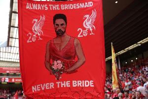 有利物浦球迷在看臺(tái)上舉了旗子,旗子上阿爾特塔被P成穿伴娘服手拿捧花。旗子上文字寫著:總是伴娘,從不是新娘