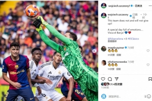 巴薩門將什琴斯尼社媒曬出比賽中撲救的照片,配文:“這支球隊沒有放棄,也不會放棄!”