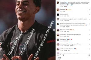 斯托伊奇科夫配的亞馬爾圖,圖中的手勢上配上文字:巴薩冠軍數(shù)(3)、皇馬冠軍數(shù)(0)、巴薩贏得國家德比數(shù)(4)