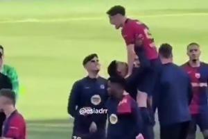 賽后慶祝時,阿勞霍直接把走過來的加維舉高高,并指了指加維。