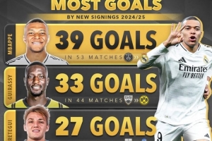 體育資訊5月13日訊 德國轉(zhuǎn)會市場統(tǒng)計(jì)了本賽季五大聯(lián)賽新援進(jìn)球數(shù)量,并列出榜單,姆巴佩39球居首,吉拉西33球次席。