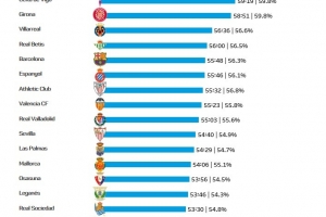 體育資訊5月13日訊 西甲第35輪比賽戰(zhàn)罷,Opta統(tǒng)計了各隊本賽季的場均凈時間,并列出名單,皇馬59分42秒居首,巴薩排名第7位。