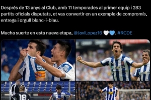 西班牙人官推發(fā)文寫道:“你已成為忠誠、奉獻(xiàn)與藍(lán)白之魂的典范,祝你在人生新的階段一切順利。”