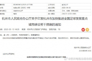 5月13日,《杭州市加快推進(jìn)全國(guó)足球發(fā)展重點(diǎn)城市建設(shè)若干措施》正式印發(fā),將于2025年6月1日起正式實(shí)施。