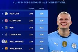體育資訊05月14日訊 德轉(zhuǎn)統(tǒng)計(jì)20-21賽季至今五大聯(lián)賽球隊(duì)進(jìn)球數(shù)排行榜,曼城293場(chǎng)打進(jìn)690球第一,皇馬和巴薩分列第五名和第六名。