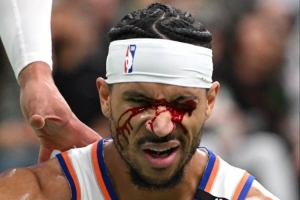 首節(jié)哈特在突破時(shí)被科內(nèi)特肘部打到眉骨瞬間血流滿面,簡(jiǎn)單治療后繼續(xù)比賽。