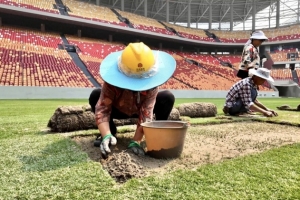 負責本次賽事草坪保障工作的深圳市嘉美茵體育工程技術有限公司總經(jīng)理張小煥介紹,之所以不直接移栽到足球場內(nèi)養(yǎng)草,主要是因為足球場為半封閉建筑,對陽光和空氣流動性的阻擋會影響草的生長。本場比賽選擇的是百慕大系列里的耐陰性草種,35攝氏度以上仍能旺盛生長,根系較深,適合重慶天氣。且能為球員奔跑提供強韌支撐,葉片質地細膩,滾動摩擦系數(shù)小,能確保足球高速滾動時軌跡的穩(wěn)定性。移植工作完成后,草坪上還將覆蓋一層細沙,局部找平,再進行打藥、防病、施肥等養(yǎng)護工作。