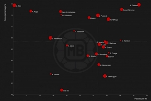 體育資訊5月16日訊 本賽季英超聯(lián)賽已經(jīng)完成36輪比賽,DataMB統(tǒng)計了英超門將本賽季的撲救成功率和每90分鐘傳球次數(shù),以每90分鐘傳球次數(shù)為X軸,撲救成功率為Y軸,列出圖表。
