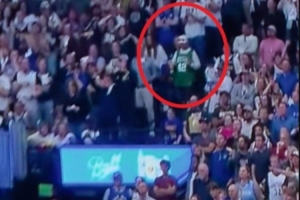 值得一提的是,今日比賽期間,場(chǎng)邊一名身穿凱爾特人球衣的球迷相當(dāng)搶鏡,站在人叢當(dāng)中,他的一身綠色非常顯眼。