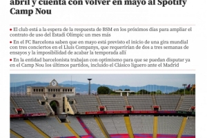巴薩已向巴塞羅那市政服務(wù)公司提出申請,本周將召開關(guān)鍵會議商討延期事宜。俱樂部對能在諾坎普舉行本賽季最后幾場比賽持樂觀態(tài)度,屆時將提供約6萬個座位。