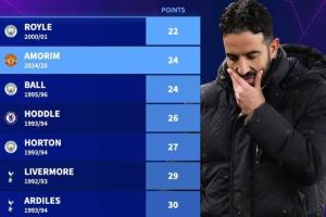 詹俊表示:“英超傳統(tǒng)六大豪門主教練上任后頭25場的英超積分紀錄。和阿莫林并駕齊驅(qū)的是英格蘭傳奇阿蘭-波爾帶曼城的1995-96賽季,積分更少的只有羅伊爾帶曼城的2000-01賽季。曼城在1995-96和200-01賽季都降級了..........