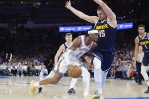 雷霆給出的辦法是抓底線。從底角三分到底線空切,這一條線其實(shí)是掘金防守布陣的薄弱環(huán)節(jié)。兵力都往中路堆,漏底角本是普遍現(xiàn)象。掘金在聯(lián)防的時(shí)候,能出現(xiàn)在護(hù)筐位置的又往往只有約基奇,而約基奇通常不會(huì)陪犯規(guī)給占據(jù)有利位置的空切球員,那么球能給到底線附近的隊(duì)友,就很有機(jī)會(huì)偷籃下。G5雷霆這個(gè)思路顯然是執(zhí)行成功的。