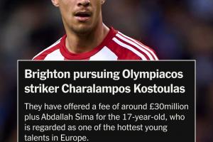 體育資訊5月17日訊 據(jù)《The Anthletic》報(bào)道,布萊頓正追逐17歲希臘前鋒科斯托拉斯(Charalampos Kostoulas),“海鷗軍團(tuán)”報(bào)價(jià)3000萬鎊并將希馬(Abdallah Sima)加入交易??扑雇欣贡徽J(rèn)為是歐洲足壇最炙手可熱的新星之一,因此布萊頓可謂下了血本。