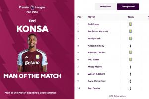 此役孔薩為維拉踢滿全場,并取得進(jìn)球,英超官方宣布,他當(dāng)選本場比賽最佳球員。