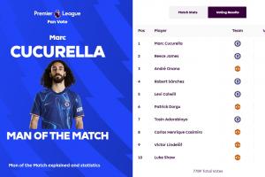 本場比賽庫庫雷利亞打進全場唯一進球,賽后他也當(dāng)選英超官方評選出的本場最佳球員。他的得票率高達70.6%。