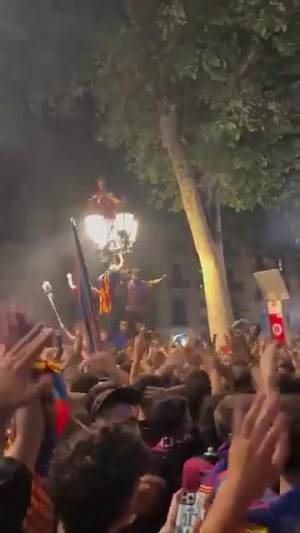 巴薩球迷們?cè)谇蜿?duì)?wèi)c祝時(shí),高喊梅西的名字。