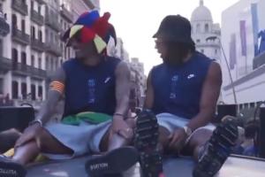 在游行大巴上,拉菲尼亞和孔德裝扮引人注意,孔德還做了個投籃手勢。