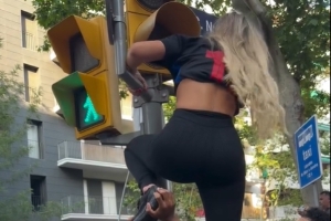 游行時(shí),拉菲尼亞的妻子娜塔莉亞更新社媒曬出一段視頻,自己在其他人幫助下想爬上紅綠燈但失敗了。