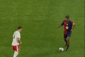 比賽中,小羅踩單車加牛尾巴過掉了對方球員,隨后對手膜拜小羅。
