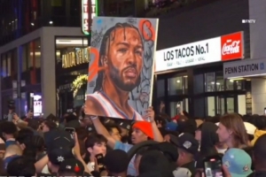 體育資訊5月17日訊 次輪G6,尼克斯主場119-81大勝綠軍,大比分4-2晉級東部決賽!賽后尼克斯球迷走上街頭慶祝晉級。