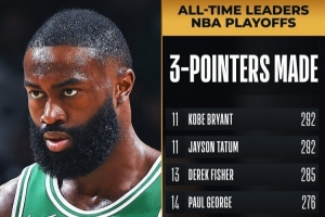 本場比賽過后,杰倫-布朗季后賽生涯三分命中數(shù)超越羅伯特-霍里,上升至NBA歷史第17位,排在他前面的是比盧普斯。
