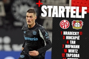勒沃庫森首發(fā):1-赫拉德茨基、3-因卡皮耶、4-若納坦-塔、7-霍夫曼、10-維爾茨、12-塔普索巴、14-???、19-泰拉、20-格里馬爾多、24-阿萊克斯-加西亞、25-帕拉西奧斯