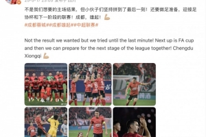 體育資訊5月17日訊 今晚進行的中超第13輪比賽,蓉城主場1-1戰(zhàn)平青島西海岸。對于這一結(jié)果,周定洋更新社媒,鼓勵球隊要打好接下來的比賽。