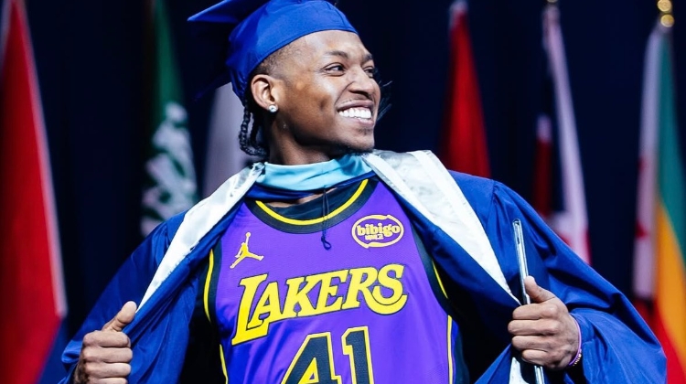 在碩士服里面,他將湖人的球衣穿在了身上。