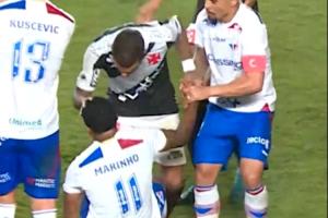 比賽第68分鐘,發(fā)生了戲劇性的一幕。福塔雷薩球員馬里尼奧用肩部頂翻瓦斯科達(dá)伽馬球員。