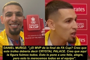 穆尼奧斯當(dāng)選本場比賽最佳球員,賽后他接受TNT采訪時說道:“足總杯決賽最佳?我想這個獎杯上應(yīng)該寫著水晶宮。我認(rèn)為今天真正的主角是我們所有人。因?yàn)槿绻幸粋€環(huán)節(jié)出了問題,我們今天就無法有如此出色的表現(xiàn)。當(dāng)選最佳球員讓人感到開心、快樂,但我們球隊(duì)中的每個人都配得上這個榮譽(yù)?!?/p>
