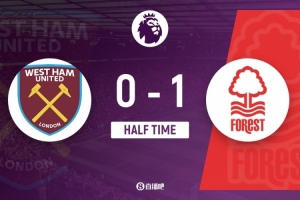傷停補(bǔ)時(shí)4分鐘。上半場(chǎng)比賽結(jié)束,西漢姆聯(lián)0-1諾丁漢森林。