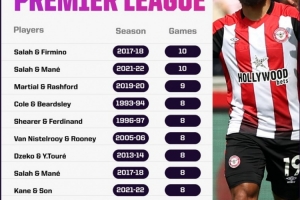 本場(chǎng)比賽布倫特福德球員姆貝莫、維薩破門,這是本賽季兩人第8次同場(chǎng)英超破門,以下為英超歷史兩名球員同場(chǎng)破門次數(shù)榜:
